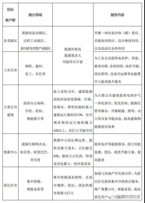為了有效開(kāi)展綜合能源服務(wù),需要明確目標(biāo)客戶(hù)群,做好市場(chǎng)細(xì)分。根據(jù)客戶(hù)用能特點(diǎn),細(xì)分不同服務(wù)客戶(hù)群體,做出相應(yīng)用能方案以滿(mǎn)足客戶(hù)深層次、多樣化的綜合用能需求,增加客戶(hù)粘性。企業(yè)應(yīng)重點(diǎn)抓住產(chǎn)業(yè)園區(qū)、工業(yè)企業(yè)、大型公共建筑、數(shù)據(jù)中心居民住宅等對(duì)象,見(jiàn)表5,瞄準(zhǔn)重大項(xiàng)目資源,統(tǒng)籌運(yùn)用能效診斷、節(jié)能改造、用能監(jiān)測(cè)、分布式能源發(fā)電、冷熱電三聯(lián)供、儲(chǔ)能等多種技術(shù),開(kāi)展綜合能源服務(wù)業(yè)務(wù)。