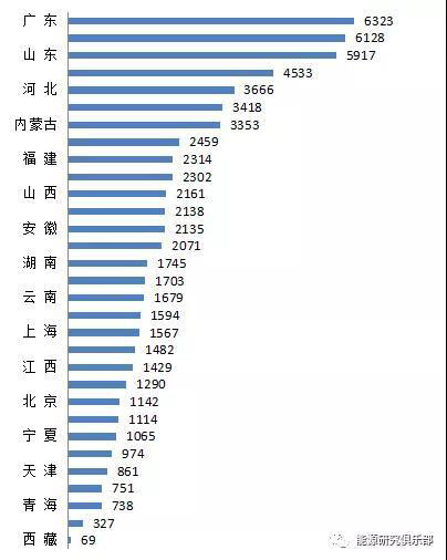 當(dāng)前,綜合能源服務(wù)的開(kāi)展主要以電能為核心,多能耦合。因此,我們重點(diǎn)以電力負(fù)荷分布作為參考依據(jù),結(jié)合熱能、天然氣等能源消費(fèi)情況綜合考慮。根據(jù)全社會(huì)用電量排行榜,2018年,廣東省仍舊穩(wěn)居第一,用電量達(dá)到6323億千瓦時(shí);江蘇省全社會(huì)用電量首次突破6000億千瓦時(shí)大關(guān),達(dá)到6128億千瓦時(shí),成為繼廣東之后全國(guó)第二個(gè)年用電量突破6000億千瓦時(shí)的省份。其次,第二梯隊(duì)的山東、浙江、河南、河北、內(nèi)蒙古用電量均超3000億千瓦時(shí),具體見(jiàn)圖4。僅這前7個(gè)?。ㄗ灾螀^(qū))的用電量就占全國(guó)總用電量的近50%。第三梯隊(duì)的四川、福建、遼寧、山西、新疆、安徽、湖北7?。ㄗ灾螀^(qū))的用電量均處于2000億千瓦時(shí)以上。上述14個(gè)省(自治區(qū))全社會(huì)用電量約占總用量的72%,應(yīng)作為重點(diǎn)目標(biāo)區(qū)域。