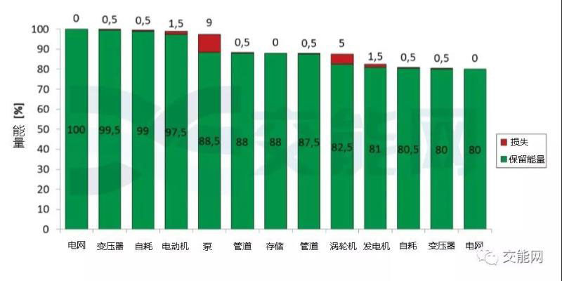 抽水蓄能有著許多其他儲(chǔ)能技術(shù)不可比擬的優(yōu)點(diǎn)。抽水蓄能電站作為一項(xiàng)100年歷史的技術(shù),比起其他儲(chǔ)能技術(shù),已經(jīng)發(fā)展的十分成熟。除此之外,抽水蓄能電站還有著長(zhǎng)達(dá)80年甚至100年的使用壽命?,F(xiàn)在的抽水蓄能電站還擁有極高的存儲(chǔ)效率,可實(shí)現(xiàn)高達(dá)80%的整體效率。 能量流和各個(gè)組件的損耗如下圖所示。并且除了充放電過(guò)程中的能量損耗,自身的損耗(所謂自放電率)極低。