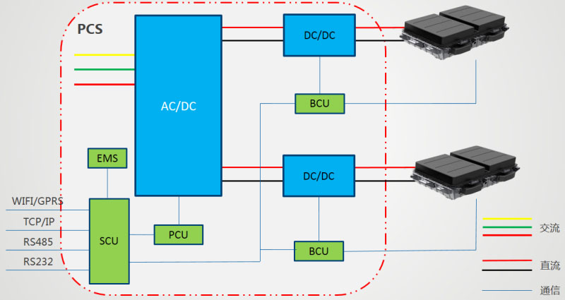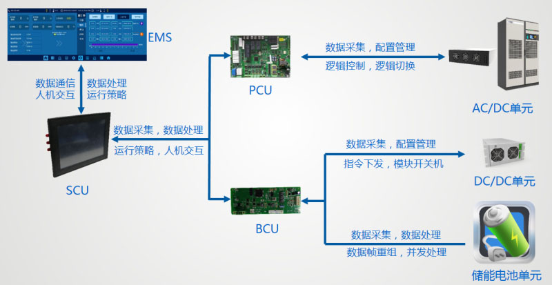 儲(chǔ)能電池種類繁多,對(duì)系統(tǒng)的安全穩(wěn)定性提出了重大考驗(yàn);儲(chǔ)能系統(tǒng)智能安全穩(wěn)定控制技術(shù),采用分層管理、分層保護(hù)、分層控制的思想,集成BCU、PCU、SCU及EMS管理系統(tǒng)。BCU對(duì)電池包及DC/DC單元進(jìn)行數(shù)據(jù)采集及數(shù)據(jù)處理,實(shí)現(xiàn)電池CAN數(shù)據(jù)幀重組保證40個(gè)電池包數(shù)據(jù)的并發(fā)處理以及系統(tǒng)指令下發(fā);PCU采集AC/DC單元數(shù)據(jù)上報(bào)到SCU,根據(jù)SCU指令進(jìn)行邏輯控制,同時(shí)實(shí)現(xiàn)配置、告警及故障管理等;SCU與電池、電表、PCU、BCU、消防、EMS等通信,收集系統(tǒng)各部件數(shù)據(jù),實(shí)現(xiàn)數(shù)據(jù)處理、運(yùn)行策略、人機(jī)交互等功能;EMS通過(guò)與SCU的TCP/IP通信獲取系統(tǒng)的所有數(shù)據(jù),提供人機(jī)交互、數(shù)據(jù)處理、運(yùn)行策略及視頻監(jiān)控等其他服務(wù),與第三方平臺(tái)通信,方便運(yùn)維,確保了儲(chǔ)能系統(tǒng)的智能安全穩(wěn)定運(yùn)行。