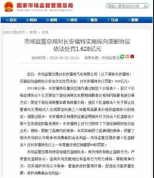 6月5日,國(guó)家市場(chǎng)監(jiān)督管理總局宣布,市場(chǎng)監(jiān)管總局近日對(duì)長(zhǎng)安福特實(shí)施縱向壟斷協(xié)議依法作出處罰決定,依法處以1.628億元罰款。長(zhǎng)安汽車(chē)(000625.SZ)股價(jià)高開(kāi)低走,盤(pán)中最大跌幅一度逾7%。