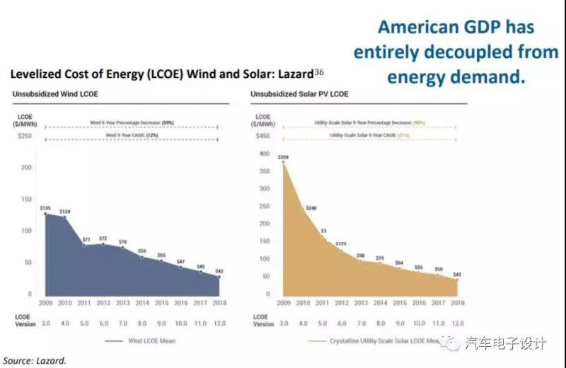 這個(gè)問題的核心還是,通用電氣對(duì)世界能源格局變化視而不見,最重要的一條是,美國(guó)由于產(chǎn)業(yè)轉(zhuǎn)移的問題,GDP的增長(zhǎng)和能源增長(zhǎng)開始脫鉤了,工業(yè)大部分都轉(zhuǎn)出去了,GDP的增長(zhǎng)和電力方面的增長(zhǎng)沒有相關(guān)性了。特別是中國(guó)在風(fēng)電、太陽(yáng)能的持續(xù)投資,使得這兩塊的發(fā)電成本持續(xù)性的下降。