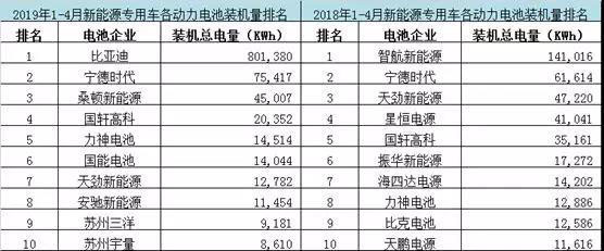 而比亞迪、國能電池、安馳新能源等電池企業(yè)則在2019年前4月沖進專用車動力電池裝機電量前十,主要配套磷酸鐵鋰電池。