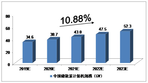 2019-2023年中國(guó)儲(chǔ)能累計(jì)裝機(jī)規(guī)模預(yù)測(cè)