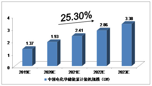 2019-2023年中國(guó)電化學(xué)儲(chǔ)能累計(jì)裝機(jī)規(guī)模預(yù)測(cè)