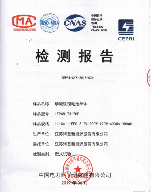 中國(guó)儲(chǔ)能網(wǎng)訊:江蘇?;履茉垂煞萦邢薰旧a(chǎn)的磷酸鐵鋰電池單體獲得中國(guó)電力科學(xué)研究院有限公司的檢測(cè),成為行業(yè)內(nèi)首批通過(guò)電力儲(chǔ)能電池國(guó)家標(biāo)準(zhǔn)檢測(cè)試驗(yàn)的公司。