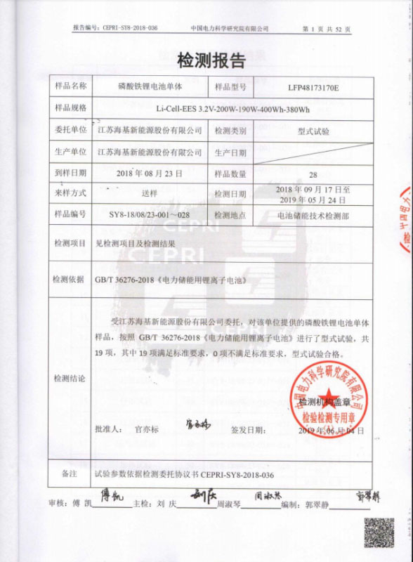 中國(guó)電科院是國(guó)家電網(wǎng)儲(chǔ)能行業(yè)產(chǎn)品專業(yè)研究機(jī)構(gòu),檢測(cè)一向以專業(yè)、嚴(yán)謹(jǐn)著稱;我司送檢產(chǎn)品嚴(yán)格按照國(guó)家標(biāo)準(zhǔn)GB/T 36276-2018《電化學(xué)儲(chǔ)能系統(tǒng)接入電網(wǎng)技術(shù)規(guī)范》要求,從2018年9月17日送檢到2019年5月24日完成測(cè)試,共經(jīng)歷了9個(gè)月時(shí)間;最終19項(xiàng)試驗(yàn)結(jié)果均滿足標(biāo)準(zhǔn)要求,全部檢測(cè)合格。