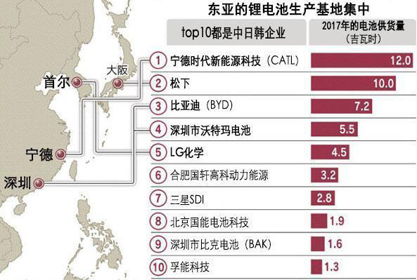 根據(jù)中國(guó)調(diào)查公司高工產(chǎn)業(yè)研究院(GGII)在2017年匯總的調(diào)查報(bào)告,中日韓三國(guó)企業(yè)壟斷了全球車載鋰離子電池供貨量排行榜前十。寧德時(shí)代新能源科技(CATL)以12吉瓦時(shí)排在榜首,該公司除向德國(guó)寶馬、德國(guó)大眾供應(yīng)電池外,2019年2月還宣布與本田進(jìn)行共同研發(fā)。