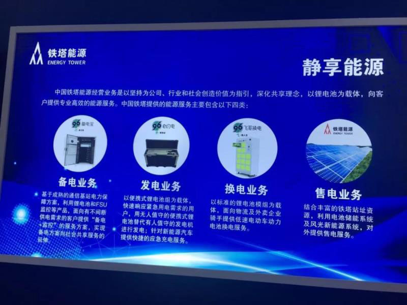 據(jù)行業(yè)媒體南方能源觀察報道,今年5月在福建福州舉行的第二屆數(shù)字中國建設峰會上,鐵塔能源已經(jīng)以獨立品牌身份亮相,并公開展示了“備電、發(fā)電、換電、售電”等能源服務資料。