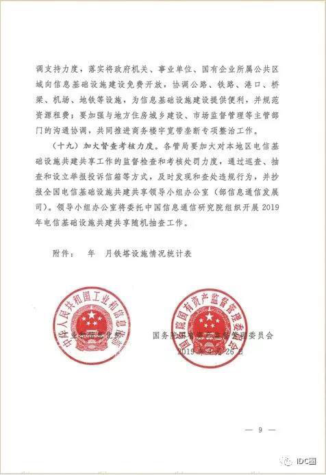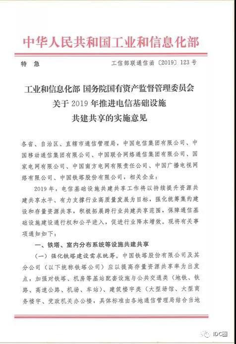 近日,工信部和國資委聯(lián)合發(fā)布了《關(guān)于2019年推進(jìn)電信基礎(chǔ)設(shè)施共建共享的實(shí)施意見》。文件指出,2019年,電信基礎(chǔ)設(shè)施共建共享工作將以持續(xù)提升資源共建共享水平、有力支撐行業(yè)高質(zhì)量發(fā)展為目標(biāo),強(qiáng)化統(tǒng)籌集約建設(shè)和存量資源共享,私極拓展跨行業(yè)共建共享范圍,保障通信基礎(chǔ)設(shè)施建設(shè)通行權(quán)和公平進(jìn)入,促進(jìn)行業(yè)降本增效。