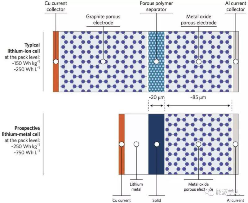 圖9 鋰離子電池(上)和鋰金屬電池(下)示意圖,鋰金屬電池包括1層隔膜和1層致密的金屬鋰。鋰金屬電池處于充電狀態(tài),鋰含量超過20%。層厚按比例顯示。鋰金屬代替石墨電極后,電池體積和質(zhì)量的減少是很明顯的。鋰金屬電極的另一個(gè)概念包括使用宿主結(jié)構(gòu),該宿主結(jié)構(gòu)限制了鋰金屬電極的體積變化。