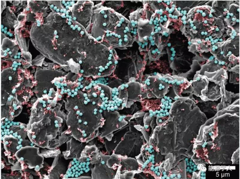 圖8 石墨與石墨間孔隙(紅色)中Si顆粒(藍(lán)色)所組成的硅碳結(jié)構(gòu)。