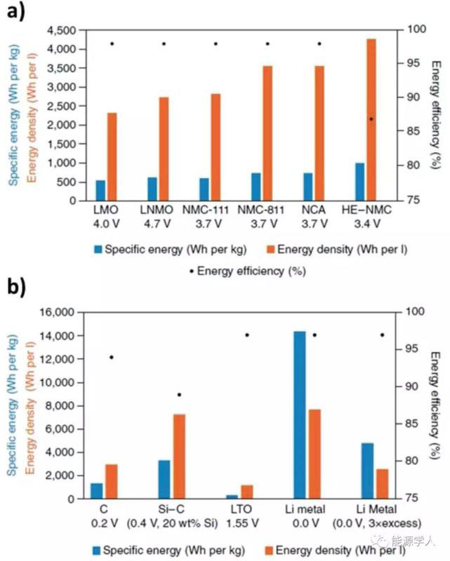 圖7 a)正極和b)負(fù)極活性材料在材料水平上的比能量,能量密度和平均能量效率。