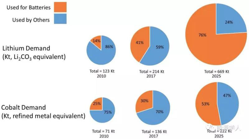 圖4 電池和其他應(yīng)用對(duì)鋰和鈷需求的變化。
