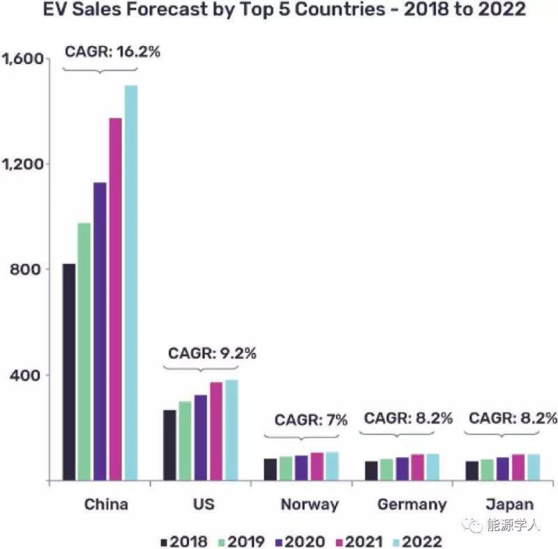 圖1 2017-2022年電動(dòng)汽車銷售額全球前五名。