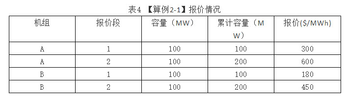 【算例2-1】兩臺機組A和B,額定容量均為200MW,各分為兩段,每段100MW,機組A的兩段報價分別為300¥/MWh和600¥/MWh,機組B的兩段報價分別為180¥/MWh和450¥/MWh。具體如表4所示。