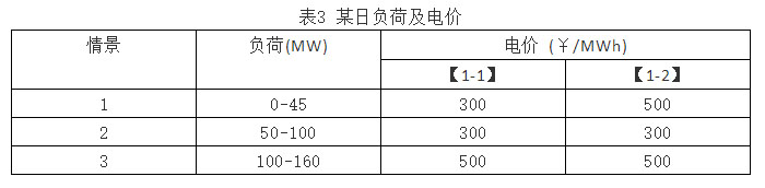 假設(shè)現(xiàn)貨市場中,機組G1和G2的報價均等于實際的成本。也就是說,每個電廠申報一段報價,申報數(shù)量分別為100MW和60MW,申報價格分別為300¥/MWh和500¥/MWh?!舅憷?-1】下沒有啟停費用,【算例1-2】下機組G1申報10萬元的啟停費用。從分析可以知道,系統(tǒng)的實時電價與系統(tǒng)負荷的關(guān)系與圖2一致。表3給出了在不同負荷區(qū)間分別按【算例1-1】和【算例1-2】計算得到的實時電價。