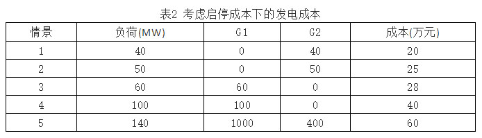 從上面的分析看到,考慮啟停成本時,系統(tǒng)的邊際成本曲線隨負荷的增長不再是單調(diào)遞增的曲線,在50MW時邊際成本下降,到100MW以后又上升。