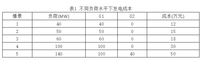 【算例1-1】如果有兩臺機組G1和G2,單位發(fā)電成本分別為300¥/MWh和500¥/MWh,G1和G2的額定容量(最大發(fā)電容量)分別為100MW和60MW。設(shè)負荷每天連續(xù)持續(xù)10小時(8:00-18:00期間),負荷水平如表1所示,其余時間負荷為零。計算在不同負荷水平下每天的發(fā)電成本。