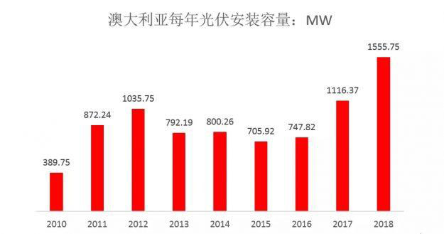 可再生能源中太陽(yáng)能表現(xiàn)亮眼,光伏安裝容量再創(chuàng)新高。2018年,太陽(yáng)能發(fā)電量達(dá)到117億千瓦時(shí),占可再生能源發(fā)電量的24%。澳大利亞清潔能源監(jiān)管中心(CER)證實(shí),到2018年12月,已經(jīng)有2百萬(wàn)戶家庭安裝了屋頂光伏。也就是說(shuō)每5戶澳大利亞住宅就有1戶安裝了屋頂光伏。在工商業(yè)領(lǐng)域,屋頂光伏增長(zhǎng)了45%;住宅領(lǐng)域,屋頂光伏增長(zhǎng)了43%。2018年澳大利亞太陽(yáng)能光伏發(fā)電新增容量達(dá)到1.55GW。澳大利亞現(xiàn)行的高昂電價(jià)被認(rèn)為是屋頂光伏高速發(fā)展的動(dòng)力源泉。