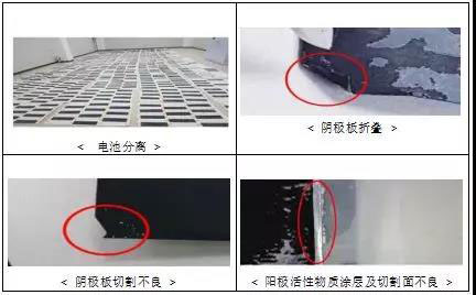 (解體、分析)多數(shù)的事故可以確定為是由于使用了同一工廠相似時期內(nèi)生產(chǎn)的電池。因此,為確認電池生產(chǎn)過程中的缺陷,對電池進行了解體分析。結果表明,一家公司的一部分電池中存在極片折疊、切割不良、活性材料涂層不良等制造缺陷。