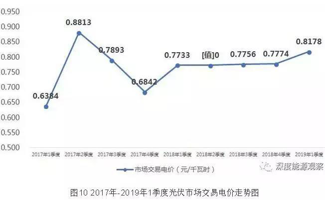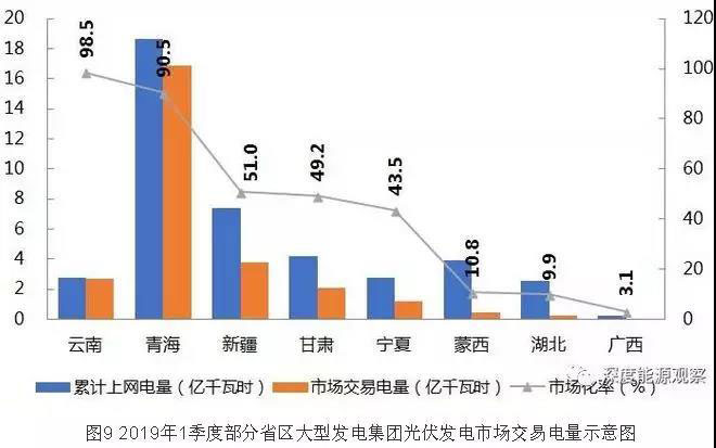 2019年1季度,大型發(fā)電集團(tuán)中光伏發(fā)電市場(chǎng)交易電量規(guī)模較大的省區(qū)分別是青海(16.9億千瓦時(shí))、新疆(3.8億千瓦時(shí))、云南(2.7億千瓦時(shí))和甘肅(2.1億千瓦時(shí)),平均交易電價(jià)(含跨省跨區(qū)外送交易)分別為0.8443元/千瓦時(shí)、0.7332元/千瓦時(shí)、0.7218元/千瓦時(shí)和0.7942元/千瓦時(shí)。光伏發(fā)電上網(wǎng)電量市場(chǎng)化率超過40%的省區(qū)分別為云南(98.5%)、青海(90.5%)、新疆(51%)、甘肅(49.2%)和寧夏(43.5%)。