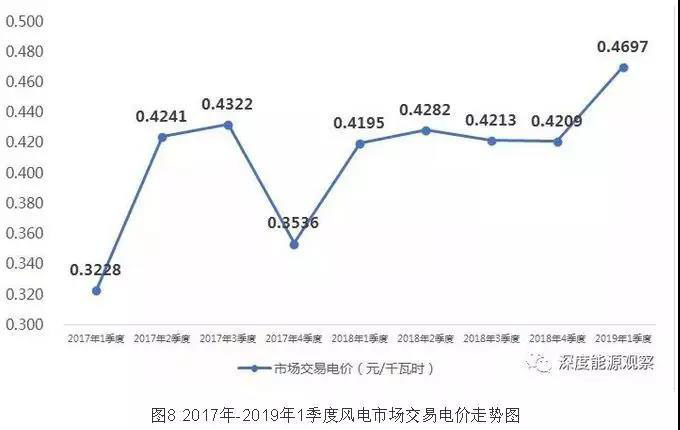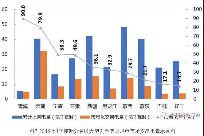 2019年1季度,大型發(fā)電集團(tuán)風(fēng)電市場(chǎng)交易電量規(guī)模較大的省區(qū)分別是云南(32.4億千瓦時(shí))、新疆(15.2億千瓦時(shí))、蒙西(14.3億千瓦時(shí))和甘肅(13.5億千瓦時(shí));風(fēng)電上網(wǎng)電量市場(chǎng)化率超過40%的省區(qū)分別是青海(90%)、云南(79.9%)、寧夏(50.3%)和甘肅(49.6%),其平均交易電價(jià)(含跨省跨區(qū)送出交易電量電價(jià))分別為0.5267元/千瓦時(shí)、0.5265元/千瓦時(shí)、0.5729元/千瓦時(shí)和0.3834元/千瓦時(shí)。