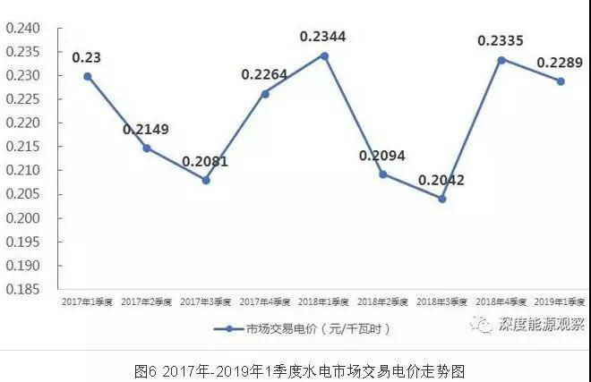 2019年1季度,大型發(fā)電集團(tuán)水電機(jī)組上網(wǎng)電量1232億千瓦時(shí),占其合計(jì)上網(wǎng)電量的14.1%;水電市場(chǎng)交易電量242億千瓦時(shí),水電上網(wǎng)電量市場(chǎng)化率達(dá)到19.7%;市場(chǎng)交易平均電價(jià)為0.2289元/千瓦時(shí),較上年同期降低0.0055元/千瓦時(shí)。