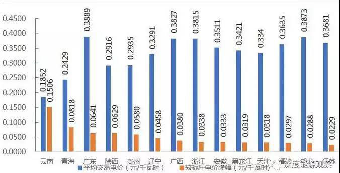從分省煤電交易價(jià)格來看,與標(biāo)桿電價(jià)比較降幅超過0.1元/千瓦時(shí)的省份是云南省,其市場(chǎng)交易平均電價(jià)分別為0.1852元/千瓦時(shí)與標(biāo)桿電價(jià)相比降幅為0.1506元/千瓦時(shí)。其次,降幅超過0.05元/千瓦時(shí)的省區(qū)有青海、廣東、陜西和貴州,其交易平均電價(jià)分別為0.2429元/千瓦時(shí)、0.3889元/千瓦時(shí)、0.2916元/千瓦時(shí)、0.2935元/千瓦時(shí)。