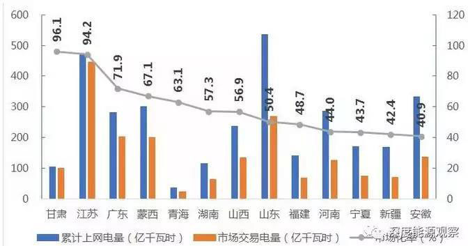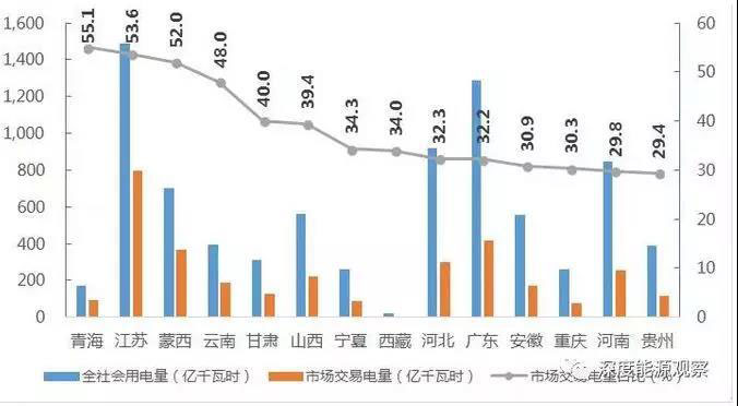 分省來看,市場(chǎng)交易電量占全社會(huì)用電量比重排序前三名的省區(qū)是青海(55.1%)、江蘇(53.6%)、蒙西(52.0%);電力市場(chǎng)交易電量規(guī)模排序前三名的省區(qū)分別是江蘇(799億千瓦時(shí))、廣東(415億千瓦時(shí))和山東(400億千瓦時(shí));省間外受電市場(chǎng)交易電量排序前三名的省區(qū)分別是江蘇(123億千瓦時(shí))、廣東(116億千瓦時(shí))、和山東(97億千瓦時(shí))。