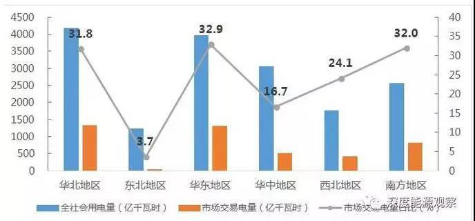 分區(qū)域市場(chǎng)來看,華北、華東區(qū)域市場(chǎng)交易電量規(guī)模分別為1330億千瓦時(shí)、1308億千瓦時(shí),兩個(gè)區(qū)域的市場(chǎng)交易電量規(guī)模占全國(guó)市場(chǎng)交易電量的比重達(dá)到了60%。華東、南方、華北三個(gè)區(qū)域的全社會(huì)用電量市場(chǎng)化率都超過了30%。