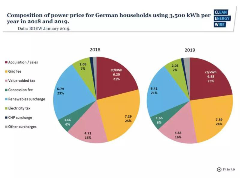 2019年德國(guó)居民電價(jià)30.22歐分/千瓦時(shí)(約合人民幣2.37元/千瓦時(shí)),其中包含可再生能源附加費(fèi)(6.41歐分/千瓦時(shí),約合人民幣0.5元/千瓦時(shí)),占到居民電價(jià)的21%。