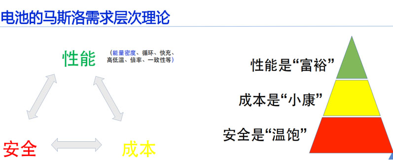 在比克看來,作為新能源汽車產(chǎn)業(yè)的重要驅(qū)動力,鋰電行業(yè)掌握著應(yīng)對以上矛盾的破局之法。陳輝表示:“著名的馬斯洛需求層次理論解釋了人類需求的階梯性發(fā)展,這一理論同樣適用于電池發(fā)展,安全、成本和性能三大需求中,安全是“溫飽”,成本是“小康”,性能是“富?!?,三者缺一不可又相互制約。面對這一局面,校準電池發(fā)展的天平,尋求安全、成本、性能三方的平衡將為新能源汽車產(chǎn)業(yè)帶來全新突破?!?