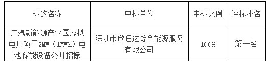 根據(jù)廣汽新能源產(chǎn)業(yè)園虛擬電廠項(xiàng)目2MW(1MWh)電池儲能設(shè)備公開招標(biāo)定標(biāo)結(jié)果,以下單位中標(biāo):