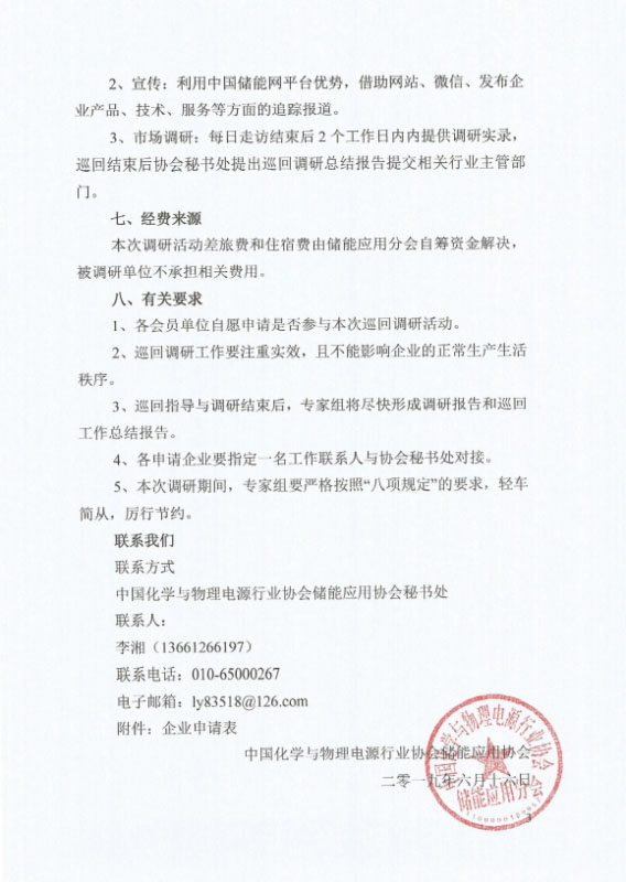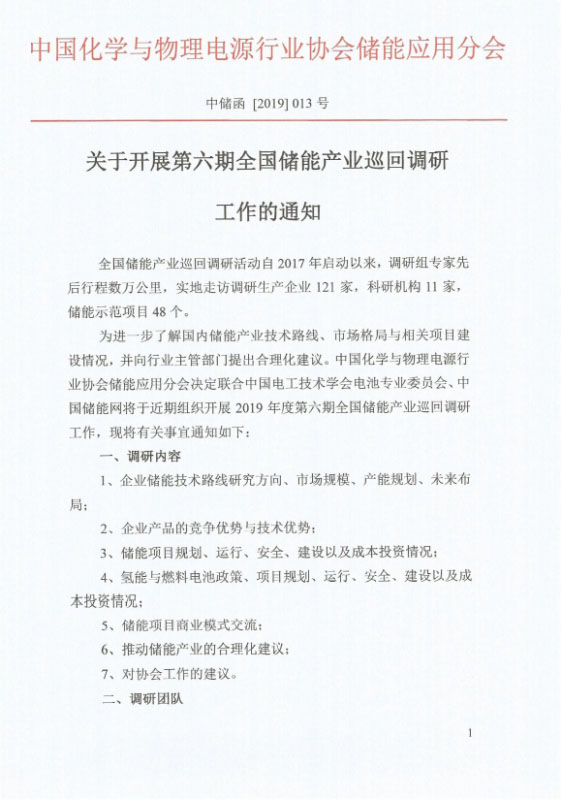為進(jìn)一步了解國(guó)內(nèi)儲(chǔ)能產(chǎn)業(yè)技術(shù)路線、市場(chǎng)格局與相關(guān)項(xiàng)目建設(shè)情況,并向行業(yè)主管部門提出合理化建議。中國(guó)化學(xué)與物理電源行業(yè)協(xié)會(huì)儲(chǔ)能應(yīng)用分會(huì)決定聯(lián)合中國(guó)電工技術(shù)學(xué)會(huì)電池專業(yè)委員會(huì)、中國(guó)儲(chǔ)能網(wǎng)將于近期組織開展2019年度第六期全國(guó)儲(chǔ)能產(chǎn)業(yè)巡回調(diào)研工作,現(xiàn)將有關(guān)事宜通知如下: