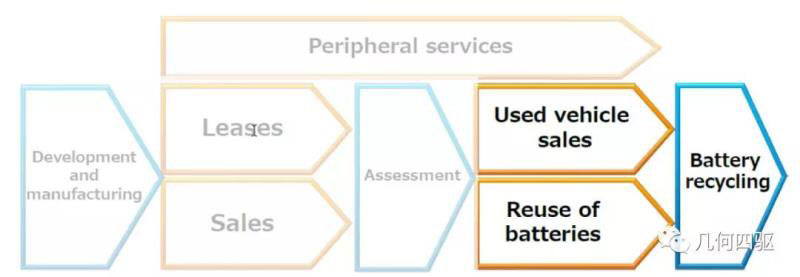 打開廉價(jià)電動(dòng)車市場(chǎng),提升電池的劣化性能,開拓全新電動(dòng)車商業(yè)模式,幾板斧刀刀入骨。豐田章男親自參與并構(gòu)建的全新商業(yè)模式不可謂不雄心勃勃,涵蓋了全生態(tài)價(jià)值鏈:周邊服務(wù)、開發(fā)和制造、租賃和銷售、評(píng)估、二手車、電池再利用及電池回收。