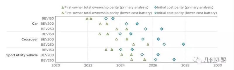 模擬計(jì)算表明,無論從總體擁有成本,還是初始購(gòu)車成本來看,電動(dòng)車在經(jīng)濟(jì)性上超越燃油車都將從低里程的廉價(jià)電動(dòng)車上發(fā)端,向高價(jià)值的車型轉(zhuǎn)移。