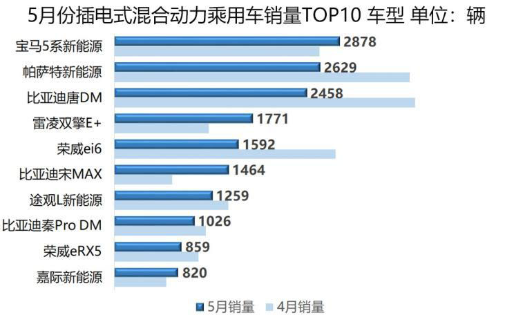 上汽大眾的帕薩特新能源繼續(xù)位居插電式混動榜銷量亞軍,但是2629輛的銷量比4月減少了30%。比亞迪唐DM本月銷量減少36%,滑落至第三,銷售了2458輛。比亞迪旗下另一款閃耀車型比亞迪宋DM本月銷售了685輛,較4月也減少了23%。升級款宋MAX本月銷量大漲,排在插電式混動車型榜第6位。
