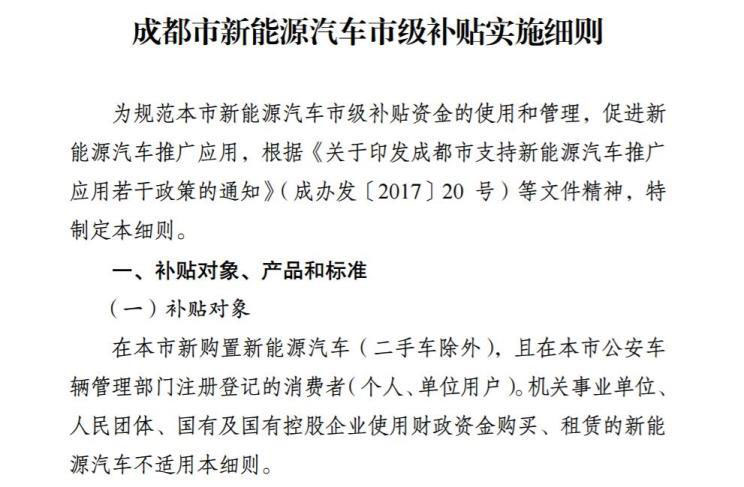 近日,成都市財政局發(fā)布了“關(guān)于印發(fā)《成都市新能源汽車市級補貼實施細(xì)則》的通知”(以下簡稱“通知”)。通知上顯示,在成都新購置新能源汽車(二手車除外),且在本市公安車輛管理部門注冊登記的消費者(個人、單位用戶)在獲得中央財政補貼的基礎(chǔ)上將獲得額外的市級配套補貼,補貼額度為中央財政單車補貼額的50%。