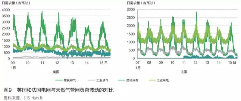 對比歐洲各國的電網(wǎng)和天然氣管網(wǎng)負(fù)荷曲線可以發(fā)現(xiàn),天然氣管網(wǎng)負(fù)荷的波動程度顯著高于電網(wǎng)(見圖9)。以英國為例,英國居民用氣負(fù)荷的峰谷比約為5~7倍,遠(yuǎn)高于電網(wǎng)的1.7倍。