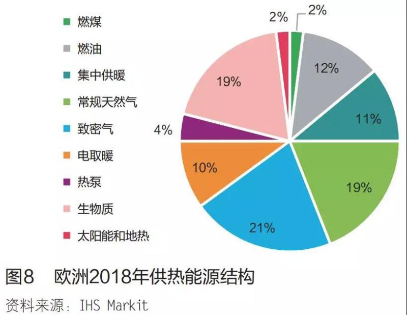 化石燃料燃燒仍是當(dāng)前歐洲最主要的供熱能源(見圖8),其中管道天然氣占?xì)W洲供暖用一次能源的40%,利用氫替代天然氣供暖是實(shí)現(xiàn)歐洲能源消費(fèi)低碳轉(zhuǎn)型最有潛力的發(fā)展方向。