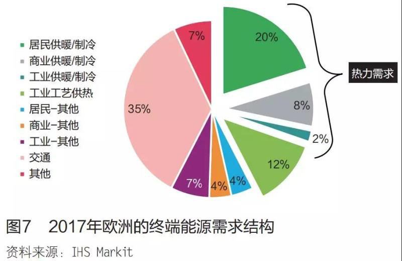 IHS Markit認(rèn)為,交通和供熱(包括建筑和工業(yè))合計(jì)占?xì)W洲終端能源需求的77%(見圖7),將是“綠氫”助力歐洲實(shí)現(xiàn)中長期減碳目標(biāo)的重要領(lǐng)域。