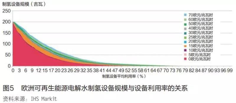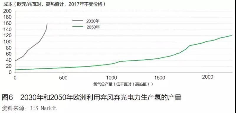IHS Markit基于歐洲電力供需和成本模型,以及氫生產(chǎn)成本模型,考慮投資成本、電費(fèi)成本、設(shè)備利用率等各個(gè)參數(shù)假設(shè),測算了歐洲未來利用棄風(fēng)棄光電力電解水方式生產(chǎn)氫的供給曲線(見圖6)。
