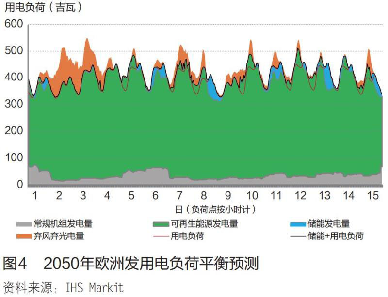 限電電量也會隨可再生能源發(fā)電裝機(jī)量的快速提高而增長。即便考慮儲能設(shè)備的削峰填谷作用,棄風(fēng)棄光電量仍將十分可觀。IHS Markit預(yù)測,2030年歐洲棄風(fēng)棄光電量將達(dá)到1200億千瓦時(shí),2050年將達(dá)到2000億千瓦時(shí)(見圖4)。
