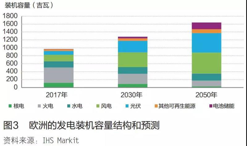 根據(jù)IHS Markit預(yù)測,2030和2050年該比例將分別達(dá)到52%和62%,屆時(shí)火電占比將分別降至20%和9%(見圖3)。