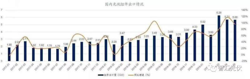 5月組件出口量為5.66GW,去年同期為2.89GW,同比增長95.6%;1~5月份累計出口量為26.25GW,同比增長84%。