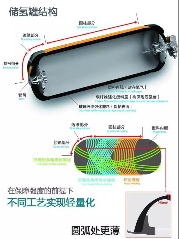 氫燃料電池的好處顯而易見,電力轉換效率極高,而且過程中十分安靜,也不會需要大量散熱。這就是為什么豐田Mirai僅僅攜帶 5kg 氫氣就能續(xù)航700公里+的原因。極大的能量密度和極高的能量轉換效率,是氫燃料電池最大的特點。燃料電池反應堆的核心技術是質(zhì)子交換膜以及催化劑,這些技術目前主要被歐美大公司所壟斷,在中國并沒有形成太大規(guī)模的產(chǎn)業(yè)化。所以反應堆被列為核心技術就很容易理解了,那么儲氣罐為什么也是核心技術呢?