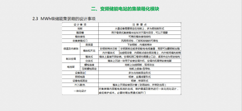第二部分,是我們針對(duì)儲(chǔ)能電站的集裝箱模塊化做了一個(gè)簡(jiǎn)單的介紹,我們最大的優(yōu)勢(shì)就是在于它的便捷運(yùn)輸,并且具有安全性,而且還能保質(zhì)保量的提高我們的效率,同比我們傳統(tǒng)建筑的效率可以提高到60%。針對(duì)儲(chǔ)能系統(tǒng)的集裝箱在現(xiàn)在市場(chǎng)上主流的尺寸大概是在20尺和40尺這兩個(gè)標(biāo)準(zhǔn)尺寸,當(dāng)然其中也會(huì)有一些非標(biāo)的尺寸,我們根據(jù)這個(gè)應(yīng)用分為了兩種,一個(gè)是電池艙,一個(gè)是設(shè)備艙。這個(gè)就是我們比較典型的應(yīng)用比較廣泛的一個(gè)模塊化的平面布局圖和我們?nèi)S的立體效果圖。針對(duì)我們儲(chǔ)能這個(gè)產(chǎn)品的一些特殊的要求和性能,我們針對(duì)集裝箱的每一個(gè)結(jié)構(gòu),都有相對(duì)應(yīng)的設(shè)計(jì)要點(diǎn)的描述,在表格中大家可以看到針對(duì)我們的產(chǎn)品,包括它的地板,包括它的接地,包括我們產(chǎn)品的入戶門還有裝飾,以及制冷和電池架,包括電氣相關(guān),我們對(duì)儲(chǔ)能要求都有相對(duì)的設(shè)計(jì)要點(diǎn)在里面,針對(duì)客戶不同的需求,我們可以在主架構(gòu)不變的情況下,進(jìn)行量身訂作的設(shè)計(jì)。