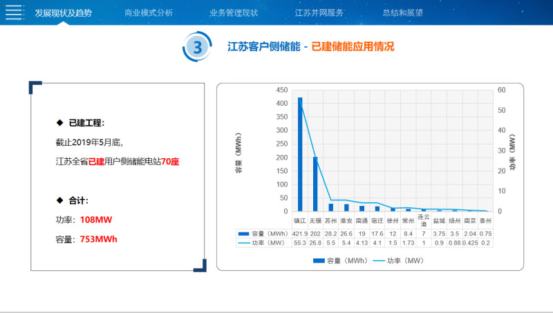 報(bào)告的第三部分是業(yè)務(wù)管理現(xiàn)狀。首先我們講到客戶側(cè)儲能對電網(wǎng)發(fā)展有利的方面,第一,延緩配電網(wǎng)升級改造。這塊和我們目前常規(guī)的客戶側(cè)儲能加載工商業(yè)用戶的情況不一樣,比如,隨著空調(diào)負(fù)荷的急劇增加,某老舊居民小區(qū)用電負(fù)荷非常緊張,但附件變電站沒有多余容量或者沒有進(jìn)線通道,如果增加小區(qū)供電容量需要對配電網(wǎng)進(jìn)行大規(guī)模改造和投資,這種情況在小區(qū)里建設(shè)儲能電站,可以緩解當(dāng)?shù)赜秒娋o張的情況,大大延緩配電網(wǎng)升級改造的緊迫性。