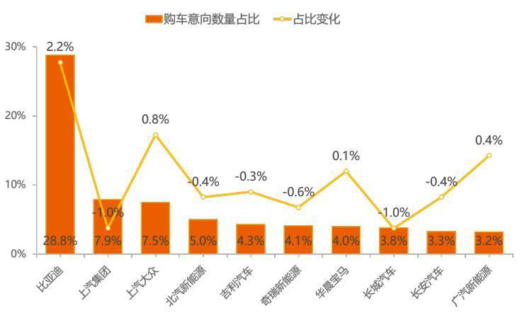 在日趨激烈的市場(chǎng)競(jìng)爭(zhēng)中,各車(chē)企對(duì)于用戶(hù)的爭(zhēng)奪也是愈演愈烈??v觀5月市場(chǎng),Top 10廠商用戶(hù)購(gòu)車(chē)意向占比累計(jì)達(dá)71.9%,相較上月份額下滑0.2個(gè)百分點(diǎn),市場(chǎng)區(qū)域集中度有所下降。十個(gè)廠商中,有4個(gè)廠商用戶(hù)購(gòu)車(chē)意向占比實(shí)現(xiàn)上漲,增幅最大的廠商為比亞迪,以2.2%的增幅領(lǐng)漲Top 10廠商;跌幅最大的廠商為上汽集團(tuán),下降比例為1.0%。合資品牌廠商僅有上汽大眾、華晨寶馬躋身Top 10榜單,用戶(hù)購(gòu)車(chē)意向占比分別為7.5%、4.0%。比亞迪為用戶(hù)最為青睞的廠商,用戶(hù)購(gòu)車(chē)意向占比為28.8%,大幅領(lǐng)先于其他廠商,榜首地位穩(wěn)固。